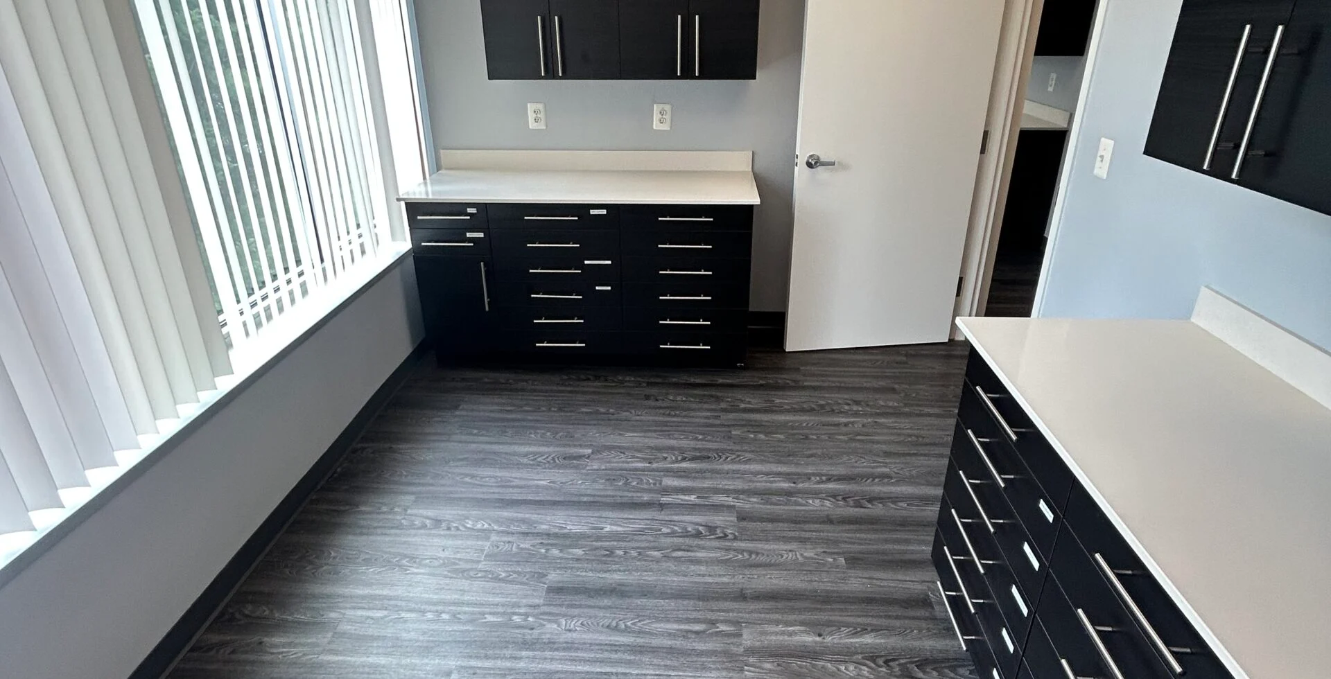 Turnkey dental office with high-end finishes, including custom cabinetry and elegant marble countertops throughout.